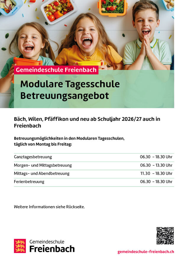 Die Gemeindeschule Freienbach bietet in Bäch, Wilen und Pfäffikon eine modulare Tagesschule an. Modulare Tagesschule bedeutet, dass Eltern zwischen verschiedenen Betreuungsmodulen auswählen. Sie können beispielsweise eine Ganztagesbetreuung buchen oder aber auch nur eine Mittagsbetreuung - ganz nach ihren Bedürfnissen. Für die Schuleinheit Freienbach gibt es bis Ende des Schuljahres 2025/26 ein Mittagsbetreuungsangebot, ab dem Schuljahr 2026/27 werden alle Betreuungsmodule angeboten. Bitte melden Sie ihr Kind bereits jetzt für die modulare Tagesschule in Freienbach an: Anmeldung Freienbach. Dies hilft uns bei der Planung. Änderungen können bis 15. Juni 2026 gemacht werden.