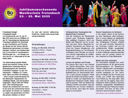 Am Wochenende vom 23. - 25. Mai 2025 wurde gefeiert. Unter dem Motto: Freienbach klingt, Freienbach tanzt! feierte die Musikschule das 50-Jahr-Jubiläum. Ein Abend der Blasmusik, ein Jubiläumskonzert mit Musik und Tanz, eine Rock-Pop-Jazz-Night mit Big-Band Finale, eine Stubete, die für richtig gute Laune sorgte und Joseph Haydns “Die Schöpfung” als musikalischer Schlusspunkt – ein Wochenende voller Musik, Tanz und Klang.
