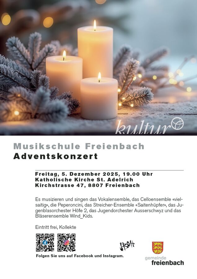Die Adventszeit kommt bald und somit auch unser beliebtes Adventskonzert: Am Freitag, 5. Dezember 2025, um 19.00 Uhr musizieren und singen das Vokalensemble, das Celloensemble «vielsaitig», die Peperoncini, das Streicher-Ensemble «Saitenhüpfer», das Jugenblasorchester Höfe 2, das Jugendorchester Ausserschwyz und das Bläserensemble Wind_Kids in der Katholischen Kirche St. Adelrich, Kirchstrasse 47, 8807 Freienbach