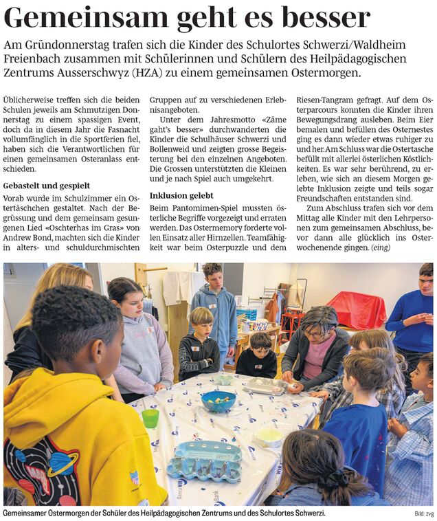 Am Gründonnerstag trafen sich die Kinder des Schulortes Schwerzi/Waldheim Freienbach zusammen mit Schülerinnen und Schülern des Heilpädagogischen Zentrums Ausserschwyz (HZA) zu einem gemeinsamen Ostermorgen. Üblicherweise treffen sich die beiden Schulen jeweils am Schmutzigen Donnerstag zu einem spassigen Event, doch da in diesem Jahr die Fasnacht vollumfänglich in die Sportferien fiel, haben sich die Verantwortlichen für einen gemeinsamen Osteranlass entschieden.