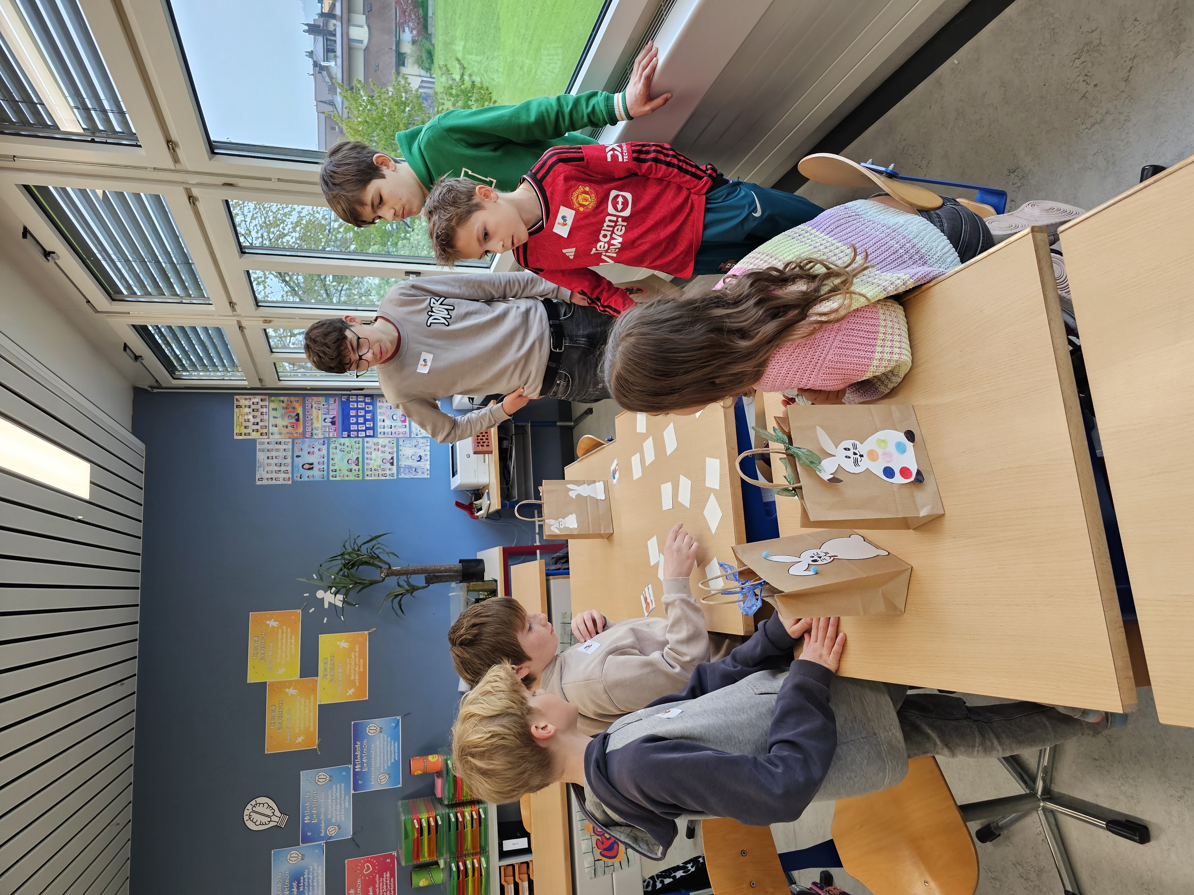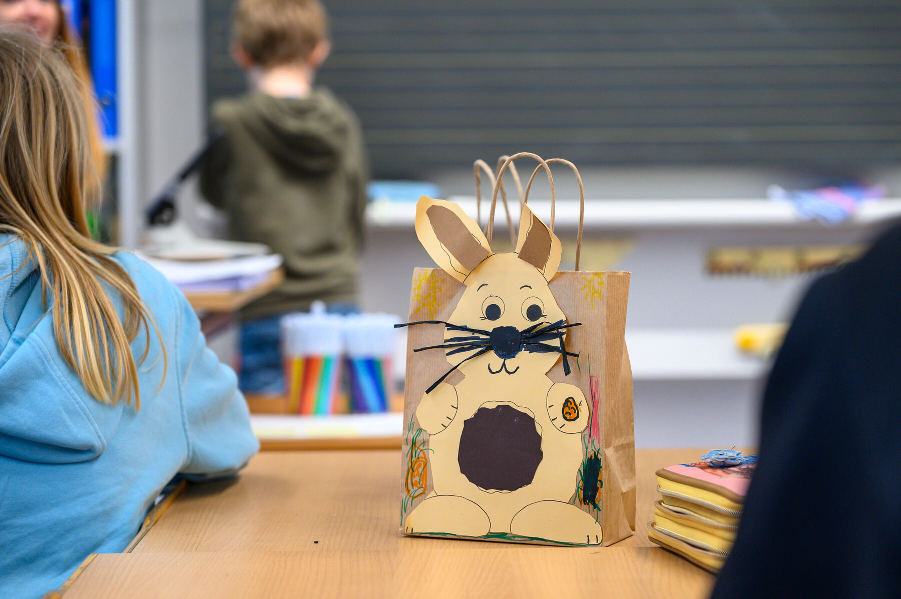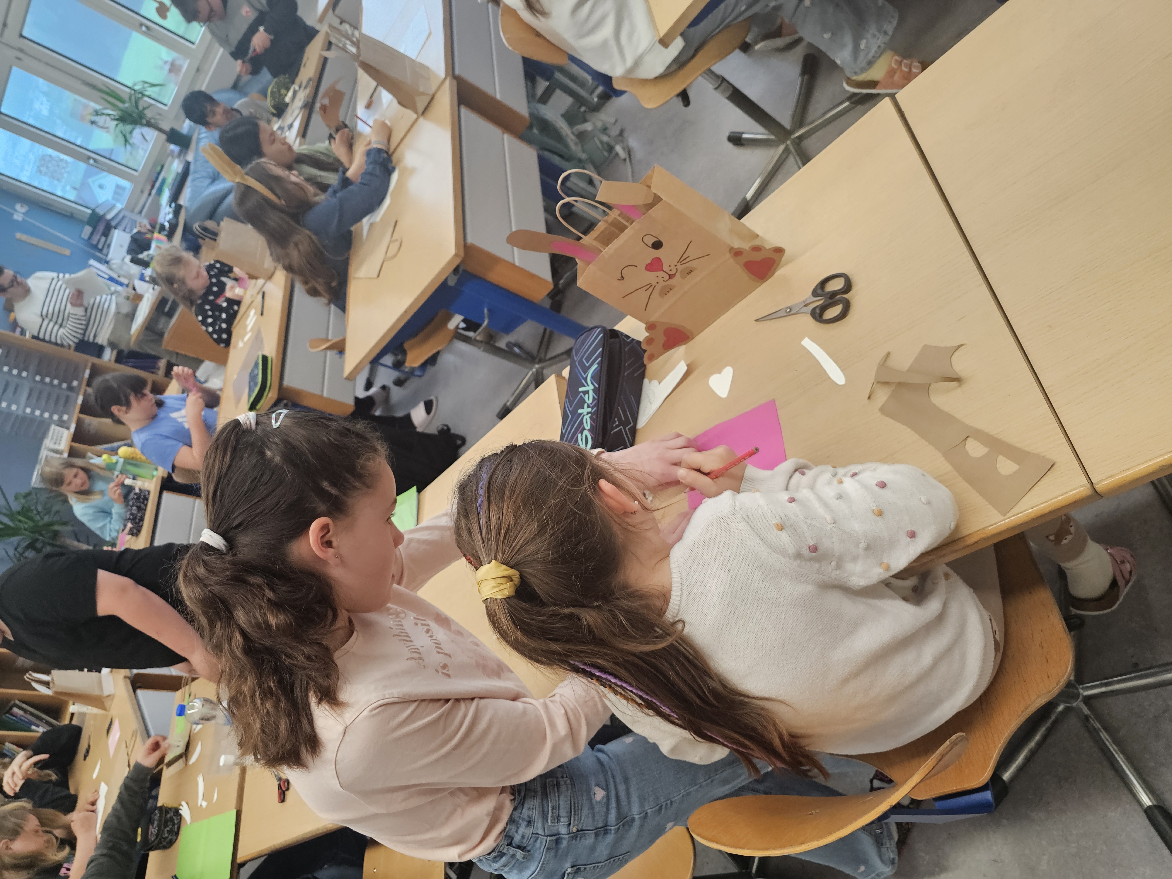Vorab wurde im Schulzimmer ein Ostertäschchen gestaltet. Nach der Begrüssung und dem gemeinsam gesungenen Lied «Oschterhas im Gras» von Andrew Bond, machten sich die Kinder in alters- und schuldurchmischten Gruppen auf zu verschiedenen Erlebnisangeboten.